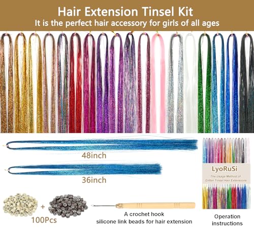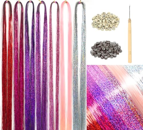 48 Inches Hair Tinsel Kit, Fairy Tinsel Hair Extensions With Tool 7 Colors*2 5250 Strands Hair Extension Tinsel Kit Glitter Hair Extensions for Women Girls Kids