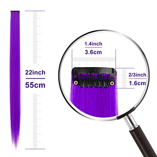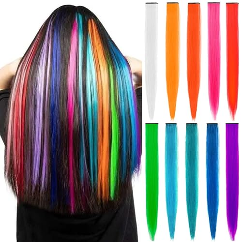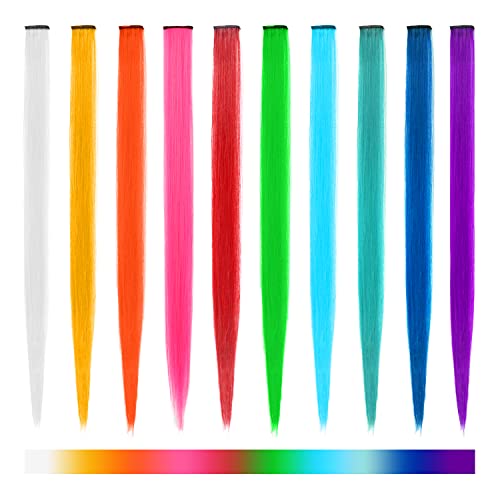 [Clip-in Colorful Hair Extensions]: Clip-on straight hair extensions, each comes with an individual clip and individually wrapped. Rainbow hair extensions include red, blue, green, purple, orange, purple, indigo, pink, yellow, white, a total of 10 pcs and 10 colors