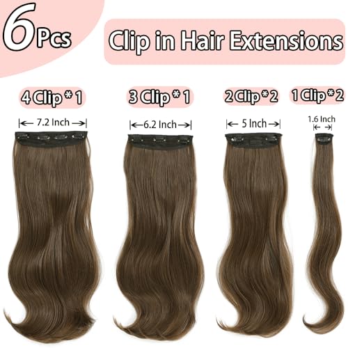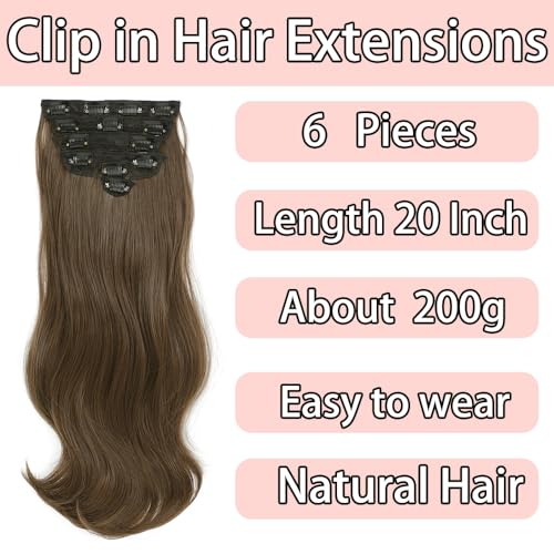 Clip in Hair Extensions for Women, 6PCS Wavy Curly Hair Extensions Clip Ins 20 Inch Long Straight layered Synthetic Clip on Hair Extensions (Chestnut Brown, 20 Inch)