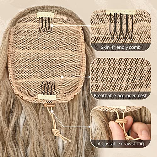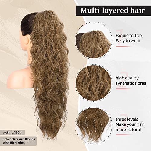 FLUFYMOOZ Ponytail Extension, 26 Inch Drawstring Ponytail Hair Extensions for Women, Long Curly Wavy Ponytail Natural Synthetic Hairpiece for Women (26″ Dark Ash Blonde with Highlights)