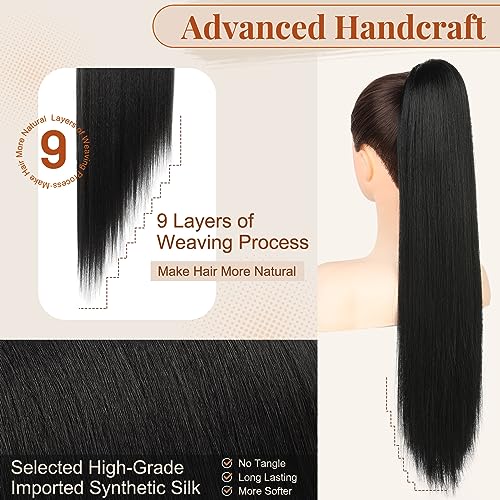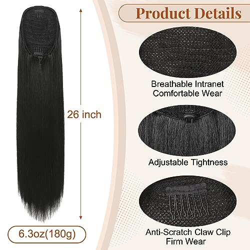 FLUFYMOOZ ponytail extension, 26 Inch Long Straight Drawstring Ponytail Synthetic Hairpieces Fake Pony Tails Natural Soft Clip in Hair Extension ponytail for Women (Natural Black)