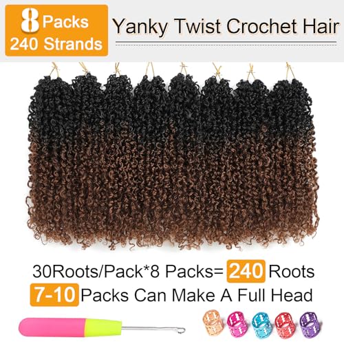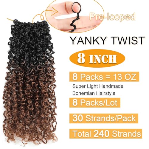 Aksice 8 Inch Yanky Twist Crochet Hair Pre-looped 8 Packs Ombre Brown Spring Twists Hair Senegalese Twist Crochet Hair with Curly Ends Synthetic Crochet Braids (1B/30#)