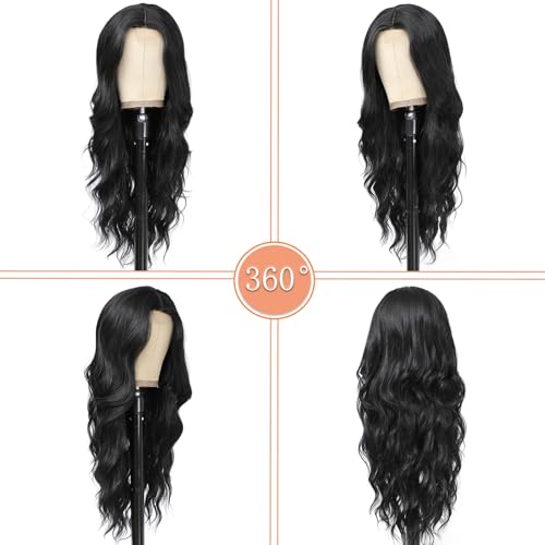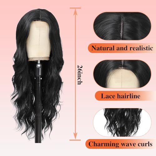 Long Black Wavy Wig with Lace Hairline 26 Inch Middle Part Curly Wigs for Women Synthetic Heat Resistant Fibers Wig for Daily Wear and Party Use (Black)