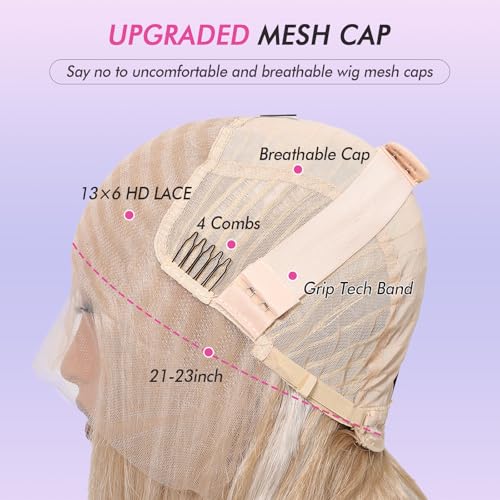 Glueless Wigs Mesh Cap :13×6 Hd Glueless Layered Blonde Wig, Natural Hairline, Flawless Melt With The Scalp, 3D Dome Cap Wig, Full Elastic Of The Cap, 4 Combs and 2 Straps,Comfortable And Breathable,The adjustable strap provides better fixation the hair;
