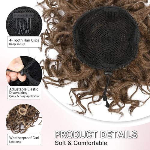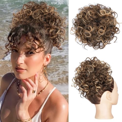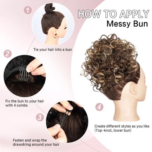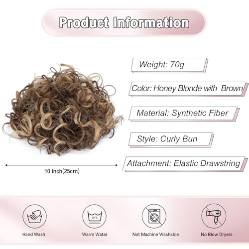 Lommel Messy Hair Bun Hair Piece,Drawstring Loose Curly Hair Buns Scrunchies Natural Soft Clip in Hair Extensions Ponytail Thick Updo Fake Hairpiece Bun for Women Daily Use(Honey Blonde with Brown)