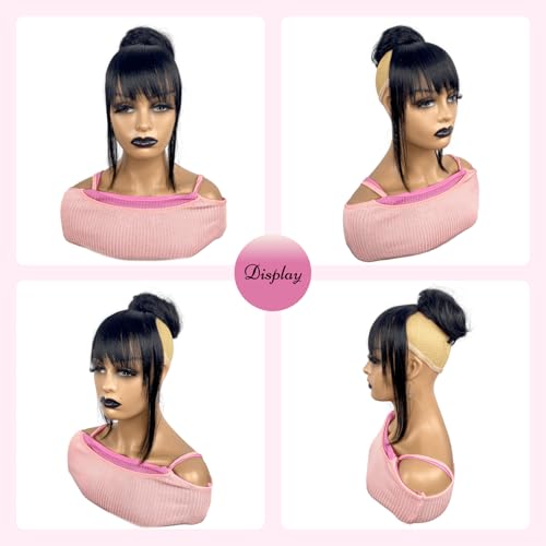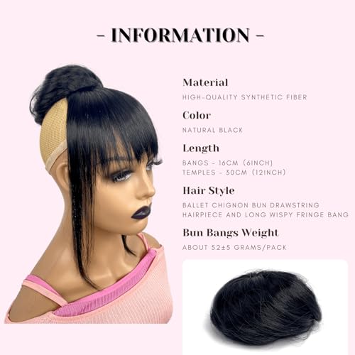 MATERIAL: Quality premium synthetic fiber hair Bangs & Bun 2pcs set. Drawstring Space buns hair piece with long wispy fringe bangs clip in. Middle-size Up-do bun and bangs ponytail hair extension for Black Women.
