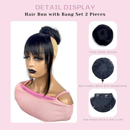 VANANGA Hair Bun with Bang Set 2 Pieces, Black Synthetic Hair Drawstring Space Buns and Long French Bangs Clip in with Temples Hair Piece Scrunchies Fake Ballet Bun & Bangs for Women(#2)