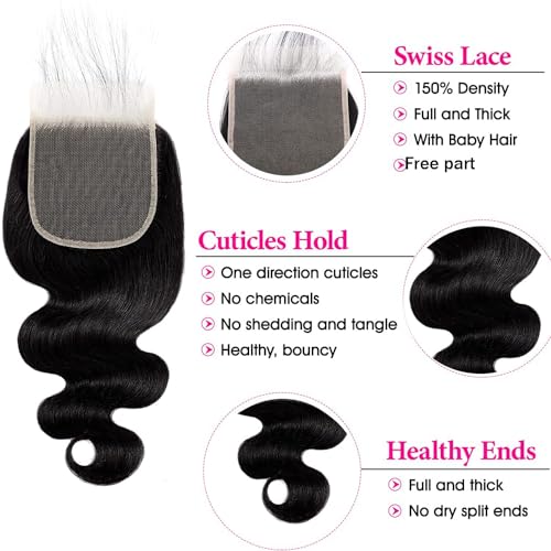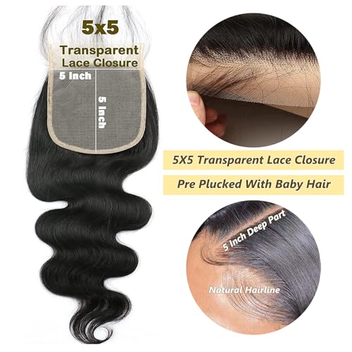 5×5 Transparent HD Lace Closure Body Wave Hair Closure Invisible Lace 150% Density 12A Real Transparent Lace Closure Virgin Remy Human Hair Frontal Closure Pre Plucked Natural Black Color 12Inch