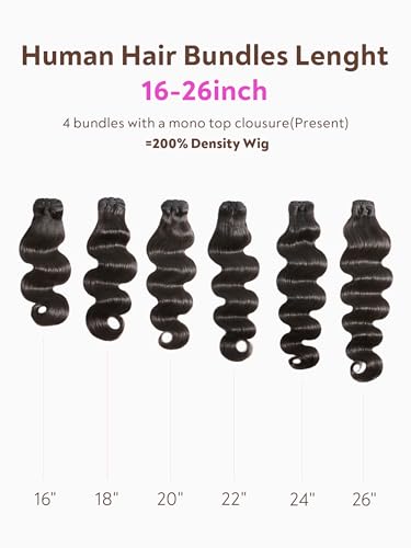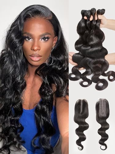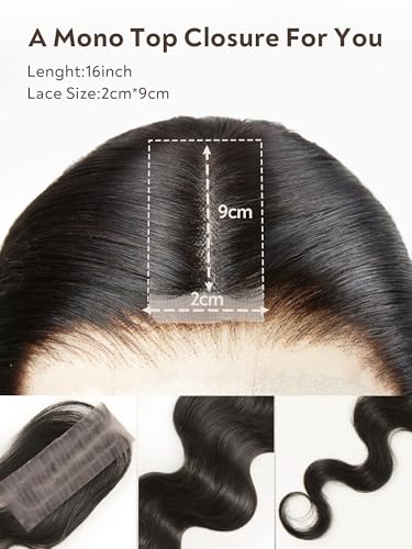Body Wave Bundles Human Hair Human Hair Extensions Natural Brazilian Virgin Unprocessed Human Hair with Mono Top Closure 4 Bundles Black Color 16 18 20 22inch