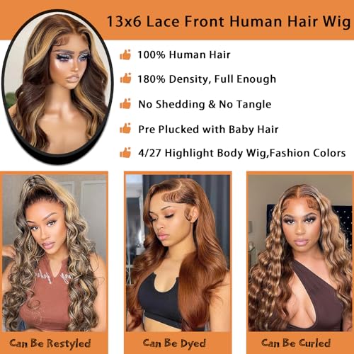 13×6 Ombre Lace Front Wig Human Hair Material:100% Human Hair Body Wave Lace Front Wigs;180% Density 4/27 Colored;Full and Thick;No Shedding;No Smell;No Tangled;Silky and Bouncy;Can be Re-bleached & Dyed & Straightened and Restyled like Your Own Hair