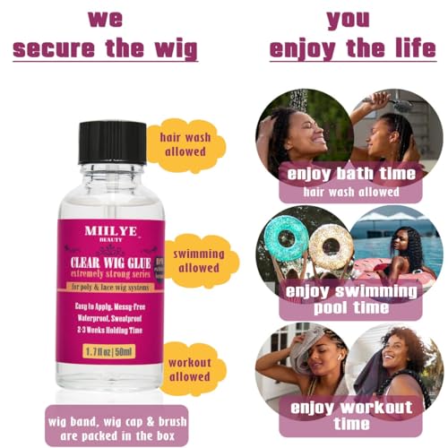 Swimming Allowed Waterproof Clear Wig Glue for Front Lace Wigs: MIILYE BEAUTY wig glue can firmly secure your lace wigs in place for 2 to 3 weeks, with its special formula, this wig glue allows you to enjoy swimming with your wig on, also the bonding area will not turn white after getting wet;