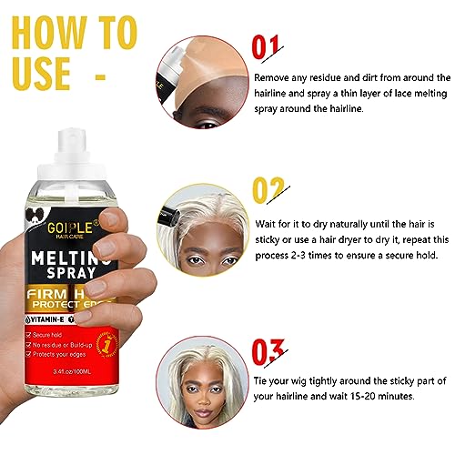 Glueless Lace Melting Spray:Our lace melting spray works great to hide your hairline, allowing your wig to blend seamlessly into your scalp for a natural wig look that brings more beauty to the world! (Tip: This lace melting spray is designed to protect the scalp. It dries slowly and needs to be dried with a hair dryer to become sticky.)